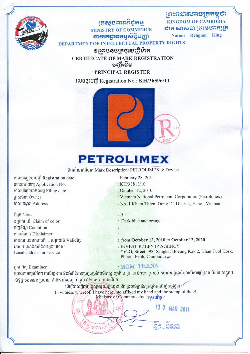 Giấy chứng nhận đăng ký nhãn hiệu tại Cambodia số 36596