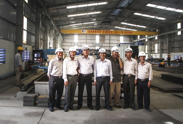Đồng chí Trần Văn Thịnh (thứ 3 từ trái sang) chụp hình kỷ niệm với một số cán bộ Công ty Xây lắp III Petrolimex trước giàn máy CNC