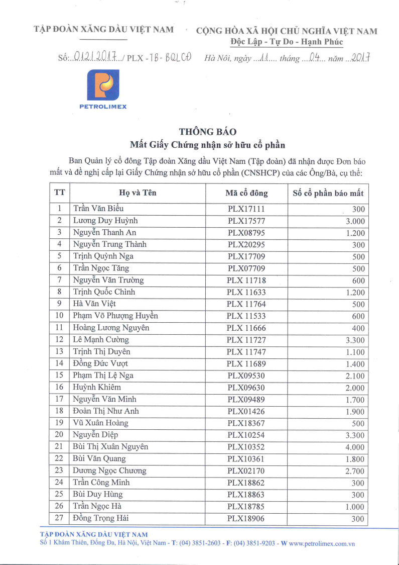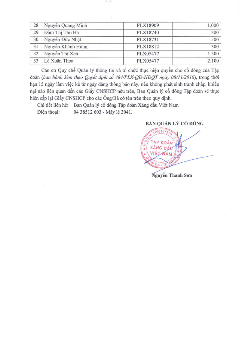 Danh sách chi tiết tạiThông báosố 012/2017/PLX-TB-BQLCĐ ngày 11.4.2017và các mẫu Đơn đề nghị cấp lại GCNSHCP & Giấy đề nghị hiệu chỉnh thông tin - để Quý vị Cổ đông thuận tiện trong tra cứu, sử dụng.
