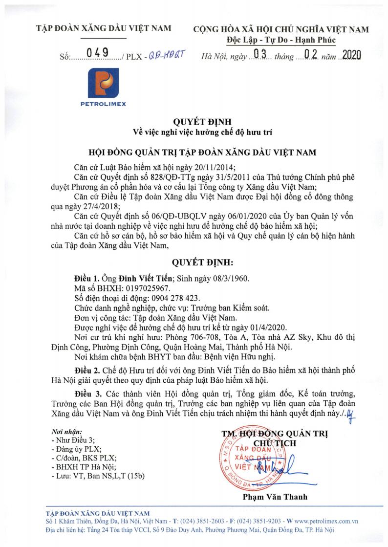 QĐ số 049 v/v nghỉ việc hưởng chế độ hưu trí của ông Đinh Viết Tiến - Trưởng Ban Kiểm soát Tập đoàn